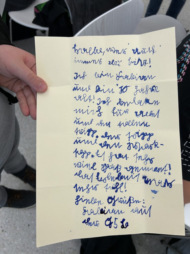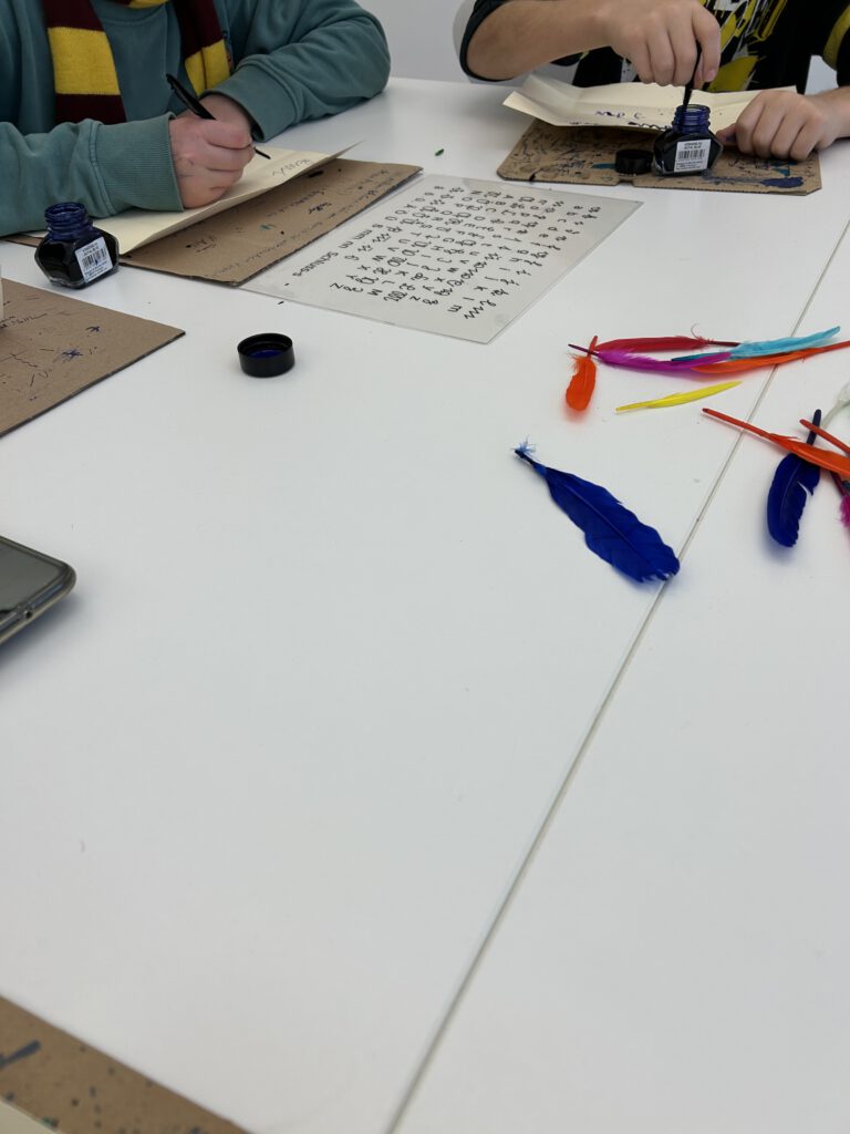 Frau Hilmes und Frau Riepe hatten einen Workshop in der „Grimmwelt“ geplant, wo man, wie zu Zeiten von Jakob und Wilhelm Grimm, mit einer richtigen Feder und echter Tinte schreiben konnte. Früher gab es eine alte Schrift und wenn heutige Schüler und Lehrer sie schreiben wollen, ist dies für alle sehr schwer. Das merkte auch die Klasse, als sie versuchte, so ordentlich wie möglich einen kleinen Brief zu schreiben. Bei vielen hat das gut funktioniert, aber bei manchen leider nicht so gut. Ein paar schöne Briefe sind aber trotzdem auch entstanden, wie die folgenden Bilder zeigen: