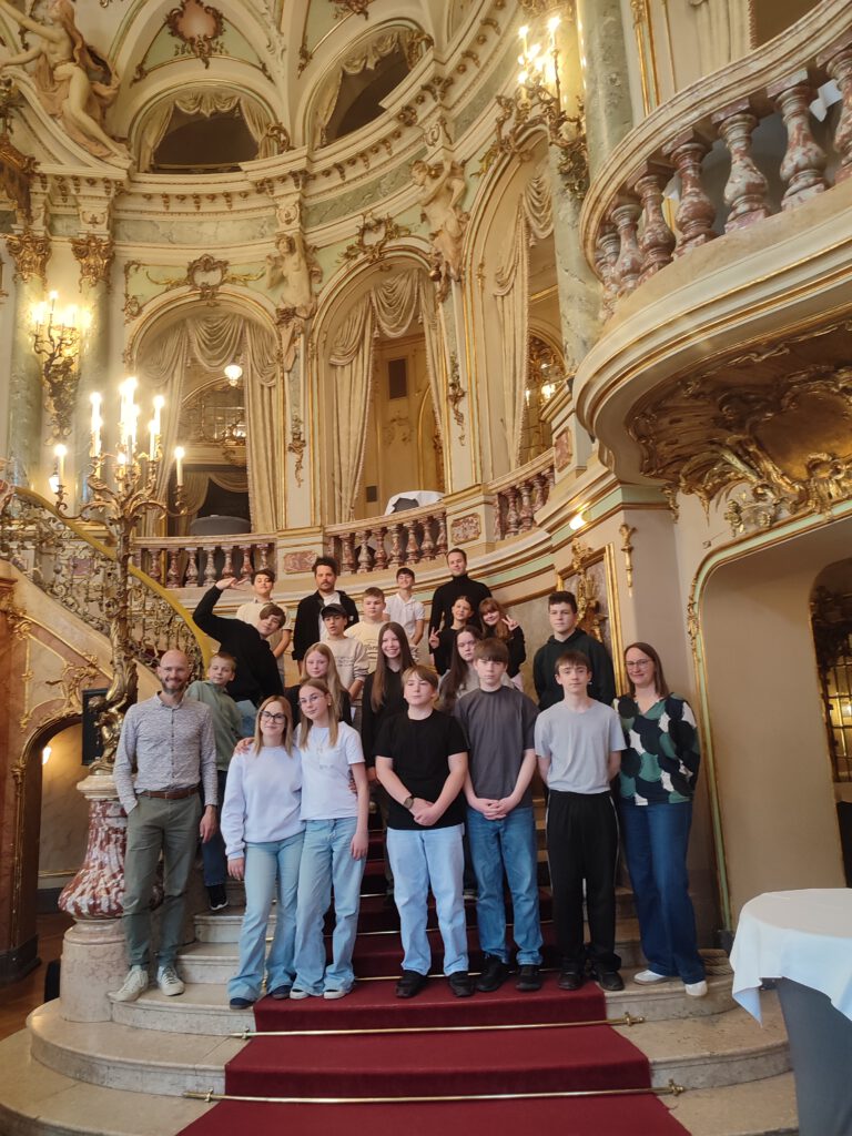 Die F6b hatte das Stück bereits in einer Kulturpause am 15.04.26 an der HGS aufgeführt, das Konzert am hessischen Staatstheater war aber nochmal eine Nummer aufregender. Nach dreistündiger Busfahrt wurden die Schülerinnen und Schüler im prächtigen Foyer in Empfang genommen und hatten streng getaktete 10 Minuten Zeit für einen Probedurchlauf auf der Bühne des sogenannten Kleinen Hauses, das sich allerdings als vollwertige Bühne mit einem 200-Personen-Zuschauerraum entpuppte.