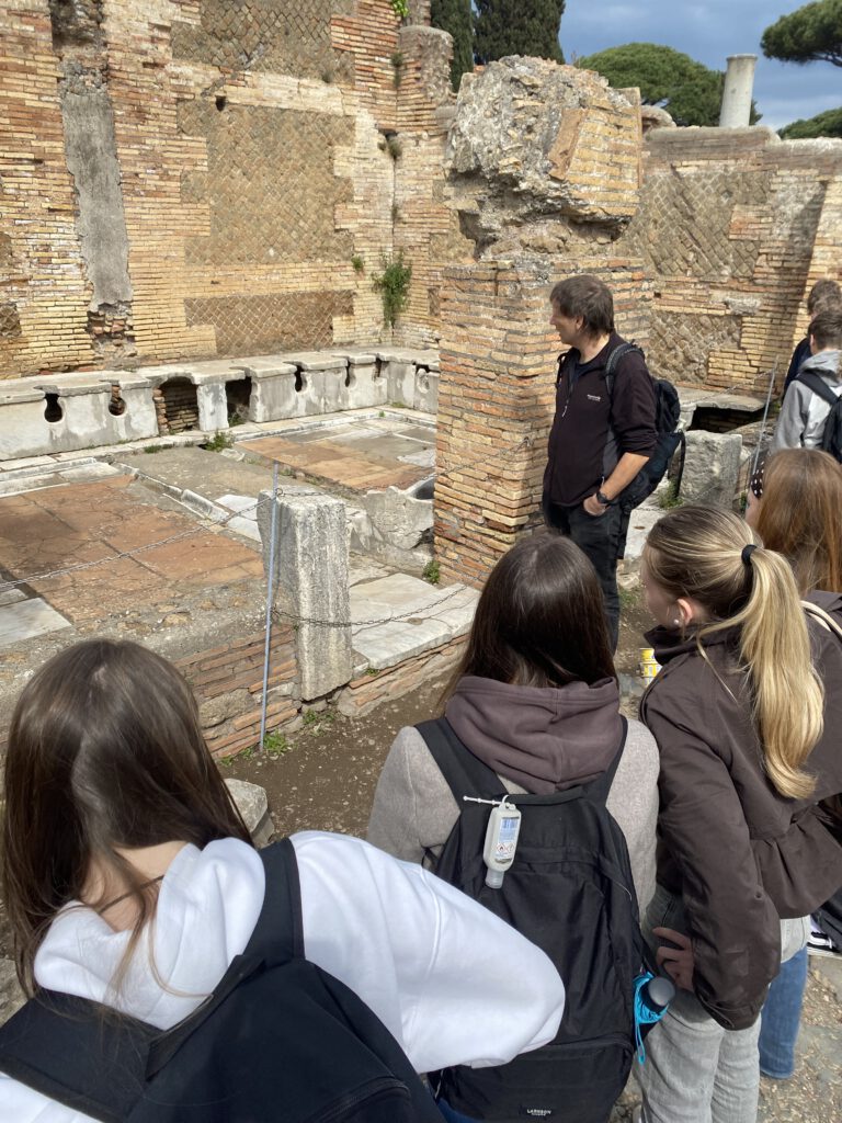 Der Sonntag führte uns nach Ostia Antica, einer gut erhaltenen antiken Hafenstadt, wo wir die Überreste antiker Toiletten fanden und lernten, woher die mit diesem Ort einhergehende Redewendung „ein Geschäft machen“ ursprünglich kommt. Außerdem erkundeten wir die beeindruckenden Mosaike in der Thermenanlage. Anschließend machten wir uns auf den Weg zum Meer, wo wir die Schönheit der Küste genießen konnten, auch wenn das Piniensterben in der Umgebung uns nachdenklich stimmte.