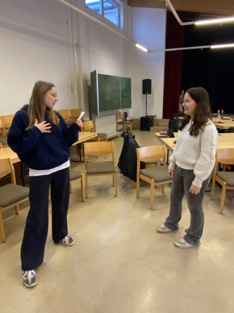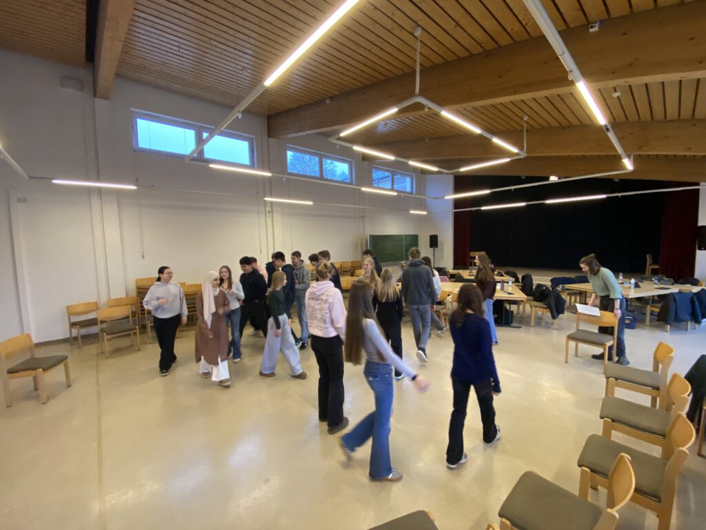 Ein weiteres Highlight des Theaterbesuchs, der im Englischunterricht der Klasse vor- und nachbereitet wurde, war die Reflexion des Theaterstücks im Unterricht mit der Theaterpädagogin des Staatstheaters Kassel, Sandra van Westen, die für einen Begleitworkshop gewonnen werden konnte. Während ihres Besuches in der Klasse wurden theaterübliche Übungen durchgeführt, und die Schülerinnen und Schüler hatten die Möglichkeit, ihre Eindrücke und Gedanken zur besuchten Theateraufführung zu teilen. Besonders spannend war die Diskussion über die symbolische Verwendung der Farbe Gelb, die im Stück für Blut und Verrat steht. Standbilder wurden gebaut, um sich die Figurenkonstellation zu erschließen und die Komplexität der Charaktere kreativ zu verdeutlichen.