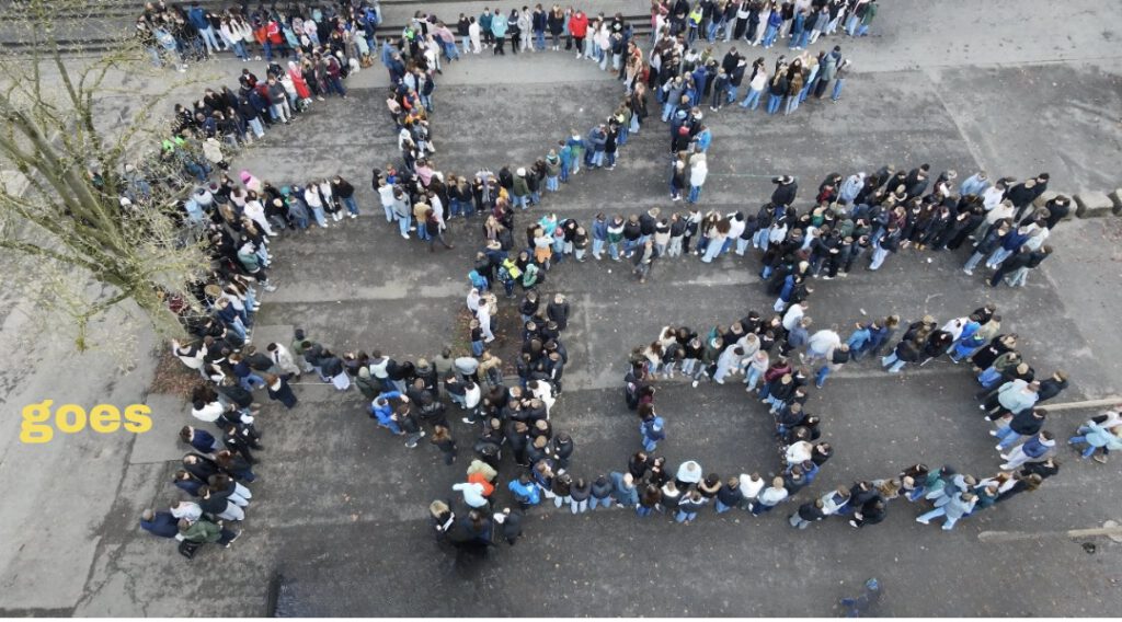 Das Quiz bildete den Auftakt, damit sich nun alle Schülerinnen und Schüler mit den Werten des ZDFs und ihren Wünschen an die Partnerschaft auseinandersetzen konnten. Abschließend ging es dann auf den Schulhof, auf dem sich die gesamte Schülerschaft als menschliche Buchstaben aufstellte und auf diese Weise die Partnerschaft mit dem ZDF an der HGS willkommen hießen: