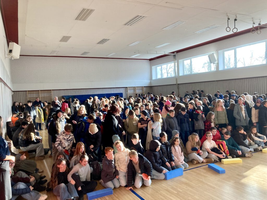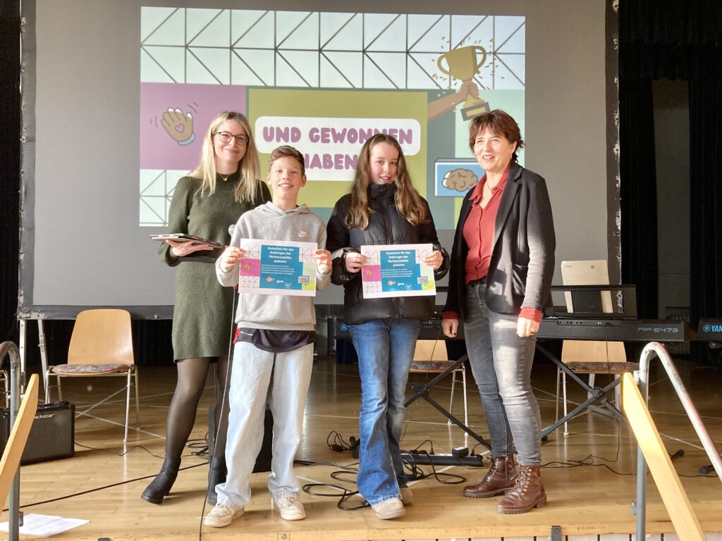 Im Anschluss daran nahm eine große Anzahl an Schülerinnen und Schülern am Quizformat „1, 2 oder 3“, abgewandelt als „ZDF goes HGS“-Edition, teil und beantworteten zahlreiche Fragen rund um das ZDF und die Initiative „ZDF goes Schule“. Bis zuletzt war es spannend, denn viele Schülerinnen und Schüler waren noch im Rennen um den Gewinn. Dieser besteht darin, die Partnerschaftsplakette im Januar mit Frau Boye-Griesel und dem Hausmeisterteam anbringen zu dürfen. Die Schätzfrage, wie viele Visits die ZDF-Mediathek im Jahr 2024 hatte, lieferte dann eine Gewinnerin und einen Gewinner: Anna Lautze (G6b) und Anton Steffen (F6a). Kräftig applaudierte die gesamte Schulgemeinde für die beiden, und auch wir gratulieren euch an dieser Stelle noch einmal herzlich. Wir freuen uns schon auf das Anbringen der Plakette im Januar mit euch!