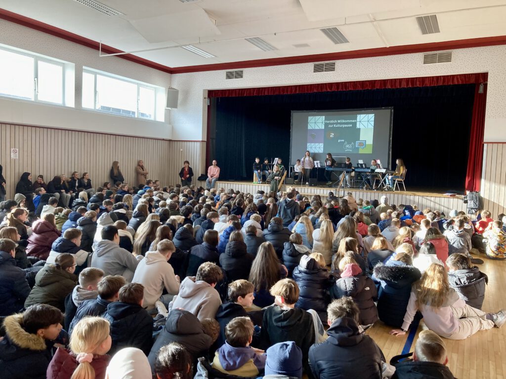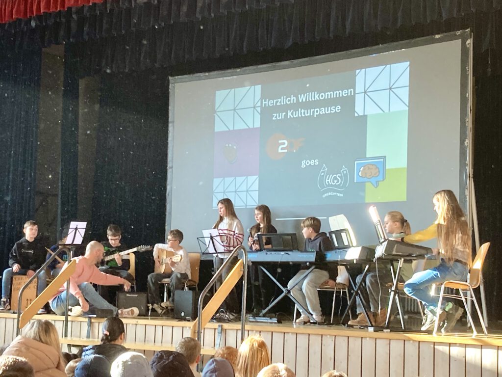 Den Auftakt bildete das vom Schwerpunktband Musik (5. Klasse) unter Leitung von Herrn Kunz selbst komponierte Lied „Your friend“, das die Schulgemeinde gleich zu Beginn begeisterte und auf die Kulturpause einstimmte.